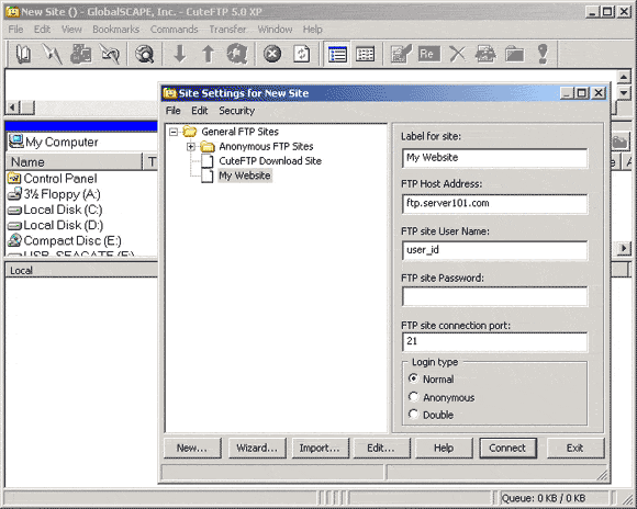 How to Setup CuteFTPCuteFTP award winning design lets you perform FTP related tasks quickly and easily. Its simple interface and connection wizard help you transfer your files in no time, even if you have no previous experience with FTP. CuteFTP's many features are well placed in the program, so it won't overwhelm you. Click here to download.1.Open CuteFTP and press 'F4' or select 'File' from the drop down menu and click 'Site Manager'. ![]() 2. Within the Site Manager click the 'New Site' button at the bottom of the dialog box and enter a name for your account profile. Enter 'UserID.server101.com' is the 'FTP Host Address' field and enter your Hosting UserID in the field below. Set the 'Login Type' to 'Normal' and click 'Exit'. ![]() 3. Select the 'Edit' drop down menu and click 'Settings...' at the bottom of the menu. ![]() 4. Open the 'Connection' tree on the left hand side and click 'Firewall'. Make sure 'PASV mode' is checked and click 'Ok'. ![]() |